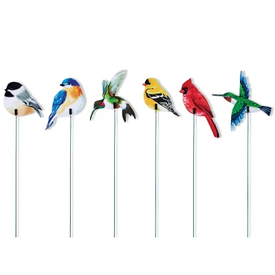 These colorful bird stakes are the perfect way to add spots of color to your home or garden. The set includes 24 stakes; 4 each of cardinals, bluebirds, chickadees, yellow finches and hummingbirds in 2 different flying positions. The realistic looking birds sit atop stakes that blend into your plants and flowers. Perfect to display indoors or outside. Plastic. Each is approx. 4″L x 13 1/4″H. Set of 24.
