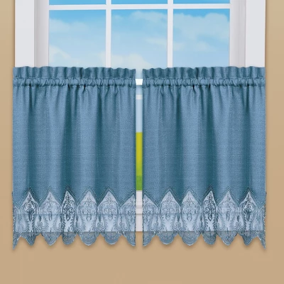 Dress your windows in style with these beautifully detailed, lace trim curtains. The tier sets are available in 2 lengths. Rod pocket tops make hanging easy. Hand wash. Polyester; imported. Choose: Sage, Taupe, Blue, White or Burgundy. Available in: 24″ Tiers (24″L x 30″W each) or 36″ Tiers (36″L x 30″W each).