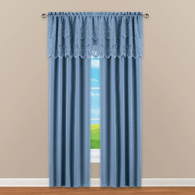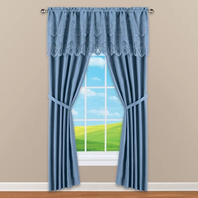 Dress up any window with this complete set that includes two panels, tiebacks and an attached valance at the top. Available in 3 colors, the panels are finished with two layers of beautiful lace at the top and have a rod pocket top for easy hanging. Machine wash. Polyester; imported. 84″L x 84″W. Tiebacks each 15″L x 1 1/2″W. Choose: Sage, White or Blue. 3-Piece Set.