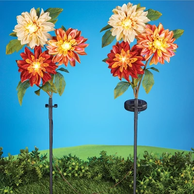 Perfect for the season, this set of two fall-colored Dahlia solar stakes are perfect anywhere in your yard or garden. Richly-colored flowers on adjustable branches are accented with greenery and solar-powered lights that automatically shine at night. Includes 2 stakes with 1 “AA” rechargeable battery. Polyester; imported. Each stake is 11″L x 32 1/4″H. Set of 2.